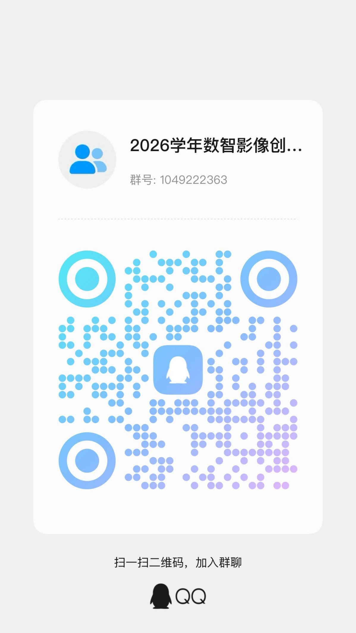 群名称:2026学年数智影像创作训练营(第二期),本次集训营的招募报名与集训相关工作由建筑艺术学院负责,请报名的同学加入以下QQ群,后续将通过群发布发布集训营上课地点及时间等信息。