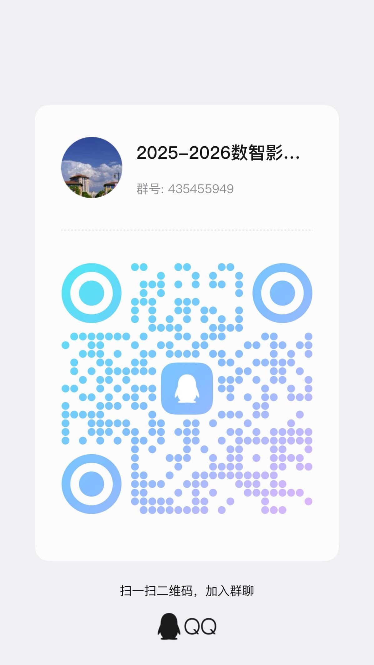 群名称:2025-2026学年数智影像创作训练营,本次集训营的招募报名与集训相关工作由建筑艺术学院负责,请报名的同学加入以下QQ群,后续将通过群发布发布集训营上课地点及时间等信息。